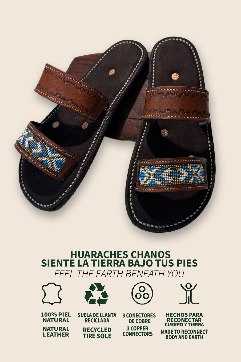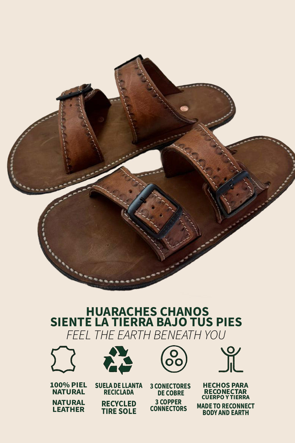Our barefoot-style huaraches are designed to reconnect your body with its original energy. Equipped with three strategically placed copper connectors, they allow the flow of electrons from the Earth into your body, promoting grounding benefits like better sleep, reduced stress, and overall balance.