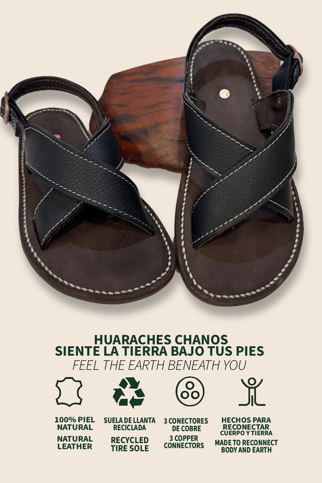 Experience natural comfort with our handcrafted black leather huaraches, featuring a durable recycled tire sole. Designed for barefoot-style wear, they include copper components that promote grounding, supporting better sleep, reduced inflammation, and improved circulation. Combining traditional craftsmanship with eco-friendly materials, these sandals offer a healthy, sustainable choice for everyday wear.