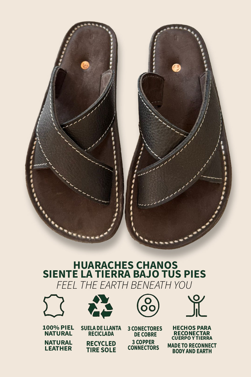 Experience natural comfort with our handcrafted green leather huaraches, featuring a durable recycled tire sole. Designed for barefoot-style wear, they include copper components that promote grounding, supporting better sleep, reduced inflammation, and improved circulation. Combining traditional craftsmanship with eco-friendly materials, these sandals offer a healthy, sustainable choice for everyday wear.